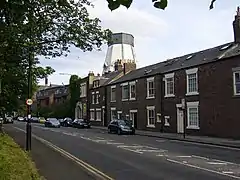 Huntsmoor House, Hunters Road, was built as a soldiers' home in 1899 to meet the social needs of those soldiers stationed at Fenham Barracks.[6] During the fifties large steam presses were installed for finishing tailored garments. Many of the operators of the presses were adults with learning difficulties. They congregated in the centre of Newcastle each morning and were then walked to Huntsmoor House to begin their work. Occasionally, one of the workers would lean out of a window to call over children playing in the backlane between Hunter's Road and Ancrum Street to send them on an errand for sweets to Jenny Proctors sweet shop. A small twist of Victory V lozenges was a favourite purchase and the child running the errand would be rewarded with half a lozenge on their return. Later, Huntsmoor House was used as a warehouse by the Newcastle bookseller Thornes[7] before being turned into student accommodation. A three-storey red brick structure, the design of Huntsmoor House is unusual, topped with a crenellated tower featuring carved shields and a flagpole. The central section is flanked by two arched windows that rise through two storeys, with a Tudor style exposed beam gable above.