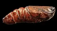 Larvae pupate in the ground soil, at a depth of 5 to 10 cm; pupae are mahogany brown and are about 16–18 mm in length and 5-6mm in width; duration of the pupal period is about 11–13 days. Female pupae may have difficulty in transforming into adults.[10] There is also sexual dimorphism between the female and male pupae. The larger size of the female may be attributed to the additional instar. Survival of males from large pupae tends to be shorter than males from small pupae.[11] Larger males and females that emerged from larger pupae tend to survive for shorter periods of time. Fecundity has also been found to be positively correlated with size.