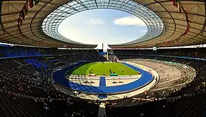 A stadium (plural: stadiums or stadia)[1] or arena is a place or venue for sports or other events and consists of a field or stage either partly or completely surrounded by a tiered structure designed to allow spectators to stand or sit and view the event.[2]