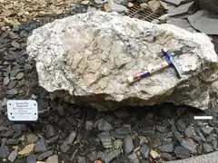 This is a relatively rare unit within the district. The mica and hornblende rock units grade into it. Only about five percent of the rock units within the district are composed of quartzite.[1]