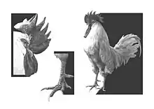 Domestic chickens have metatarsal spurs which project from the axis of the metatarsus at an angle of about 90 degrees and are pointed posteromedially at about 45 degrees. They are placed between the middle and distal thirds of the metatarsus.[13] Both hens and roosters can develop spurs, but they are more common and generally larger and better developed in roosters. Domestic and wild turkeys also have metatarsal spurs. In wild turkeys, the spurs continue growing through life and become longer and sharper. Spur length is generally considered to be the most reliable characteristic in determining the age of wild males. There are also differences in spur length between the different sub-species, probably due to habitat differences. Ocellated turkeys usually have the longest spurs; they generally live in swamps and areas with soft dirt and few rocks so they do not wear off the spur tips. Contrary to this, the western sub-species, like the Merriam's, often live in rocky areas which usually means even very old birds will have spurs that have been worn off to less than 2.5 cm long.[14] During mating in domesticated hens and turkeys, the claws and spurs of the male may often scratch and injure the back and shoulders of the female. To prevent this, the females are sometimes fitted with "saddles" to protect them.[15]
