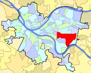 Squirrel Hill South has nine land borders with the Pittsburgh neighborhoods of Squirrel Hill North to the north and northwest, Point Breeze to the northeast, Regent Square to the east, Swisshelm Park to the southeast, Glen Hazel and Hazelwood to the south-southwest, Greenfield to the southwest, and South Oakland and Central Oakland to the west. Across the Monongahela River to the south-southeast, Squirrel Hill South runs adjacent to Homestead.