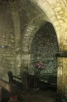 The interior of the chapel is approximately 7.7 metres (25 ft) square.[1] In the centre is a square pier supporting four square rib vaults, with the heavy ribs leading to transverse arches, all stop-chamfered.[4] In the north-west side is a Norman round-arched doorway. A small window is contemporary with the doorway. The corners of the chapel are orientated towards the cardinal points. The interior of the chapel contains a 12th-century groin vault, supported by a central column. Evidence uncovered during 20th century repairs to the chapel roof suggest that it may have been topped with a beacon at some time.[3] The roof now bears a stone cross erected in 1873.[5]