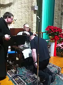 The monks pray Vigils, Lauds, Midday Prayer, and Vespers together in the abbey church. Compline is prayed privately. Lauds and Vespers are chanted and accompanied with organ. Each office includes a hymn. Mass is celebrated daily with Lauds. Lauds and Mass are celebrated at 6:10 am Monday through Friday and at 7:10 am on Saturday and Sunday. Midday Prayer is prayed at 11:45 am daily. Vespers are prayed Monday, Tuesday, Thursday, Friday and Saturday at 5:20 pm. Vespers are prayed at 5 pm on Wednesday and with Benediction on Sunday at 7:30 pm. Vigils are prayed daily at 7:05 pm, except on Wednesday and Sunday when they are prayed privately. The Divine Office is prayed according to a two-week cycle of Psalms from custom-printed office books. The office is presided by a monk-priest or transitional deacon unless designated by the abbot.