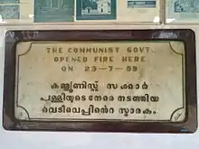 In 1959 Catholics took to the streets of Kerala to protest against the first Communist Government in the state headed by E. M. S. Namboodiripad. The rebellion was caused by a state legislation that would have potentially taken over Catholic education facilities under government control. This was known as Vimochana Samaram or Liberation Struggle. In the same year, on 23 July, Kerala Police fired at the St. Anthony's Forane Church on the part of Liberation Struggle. A memorial had been erected at the church courtyard then. The memorial says, Communist Government fired bullets to the Church here. The struggle of 1959 had led to the dismissal of the first democratically elect Communist Government in the world.[14]