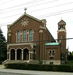 The church is the most visually catching structure. It is built in the form of a Latin cross, of mixed red and brown tapestry brick. The main façade has a gable form with a Romanesque arcaded portico containing the entrance and three tall windows above.[2] A wheel window is placed in the pediment. Single-story wings with entrance doors flank the front, and a tower is located on the right side of the building.[2]