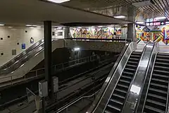 The abstract enamel mural Tempo by Gordon Rayner[7] is on the mezzanine-level bridge crossing the tracks.