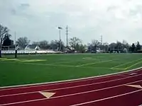 Construction on the school's current facility began in 1949 on a site that once served as a resting and feeding stop for cattle trains passing through from western states to eastern markets on what is now known as the Norfolk Southern roadbed.[2] Classes began immediately in a temporary location roughly three blocks west of the school’s current location in the building of the former St. Theresa's Academy. A year later, new freshmen were taught in makeshift classrooms in the basement of St. James Grade School, located roughly 1.5 miles away at the corner of Detroit Road and Granger avenues.