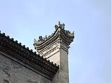 The Baroque facade has three arched entrances. It is decorated with brick carvings featuring traditional Chinese patterns, including flowers and Taotie.[23] On the facade, there are 16 granite Ionian columns, and the top of the columns are decorated with flowers.[25][9] During the 1991 restoration, the columns on the facade were painted black. The black paint was removed in the 2004 restoration.[10]