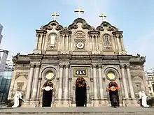 On the upper part of the facade, there is an electronic clock.[9] There are three aluminum crosses on top of the facade that were installed in 1991 to replace originals that were destroyed during the Cultural Revolution.[10]