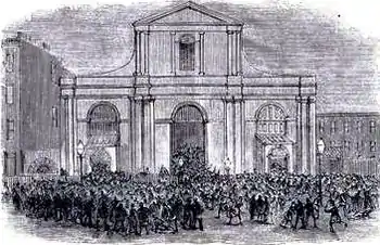 The original church was founded in 1851 by Jesuits from the village of Fordham.[1][2] Its original sanctuary, designed by William Rodrigue, was the scene of a panic on March 8, 1877, when someone shouted "Fire!" in the church during mass; seven people died.[3] This church was torn down in 1878.