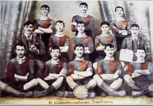 During the 1880s, a group of Maltese youngsters was watching English soldiers playing football at the Verdala Barracks; an officer gave the young Maltese a ball and that was the start of the game on the island. They formed the first football club in Malta and named it Santa Margherita; two other clubs emerged soon after: St. Andrews and St. George's. The three clubs in Cospicua merged in 1890 to form one club, holding on to the St. George's name.[3]