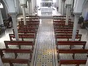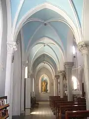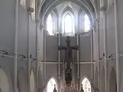 The imposing gate and the flowered garden, which is large welcome visitors who approach the church. The wooden gates with the windows create an atrium that blocked the direct entry into the church and keep the general information of the church on the opposite wooden wall. When visitors enter the church the detail of arches and the ornament columns that has the cross symbol on them attract the attention, which connect the arches each other. Moreover, the colored windows, which are called as stained glass as an architecture term, create an exciting effect on visitors. Also, the high ceiling with the great wooden cross symbol that is above this ceiling and the sculptor of Isa located behind the cross makes the visitors more exciting and feels like they have new and amazing experience. There is a cabin that is used to confess next to narrow spiral stair while there is a sculpture, which are one of the sculptures in some corner and walls in church. Some sculptures placed all around the church that are unhidden although, some of these sculptures are hidden inside the aisle and sides of the transept to emphasize these sculptures. Especially, miniature model of the faced made from plaster is attractive which is located on the wall of apse, behind the marble altar. The wooden seating areas, which are placed near the extended approach, reflect the importance given to religion by architect and the community at that time. In addition, the type of clearstory windows creates a stir on the visitors emotion while they ware walking towards the altar.
