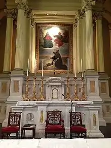 Saint Ignatius church has a free standing altar built by a South Baltimore company featuring hand-carved wood Ionic columns mirroring the external architecture. Behind the main altar, the church features a painting of St. Ignatius' mystical experience outside Rome at La Storta by Constantino Brumidi.