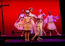 Photo: Grace Brunet as Lorilia, Carina Cook as Princess Lilywink, Hailey Weber as Princess Auria, Analyse Bullock as Shaylee, Tessa Harper as Onagh Queen of the Fairies and Ava Rutherford as Forsythia in Orchard of Hide & Seek