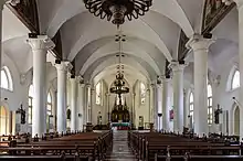 St. Joseph's Church is located on the east side of Ronggo Warsito Street in Semarang, Central Java. Administratively, it is part of the parish of St. Joseph in the Archdiocese of Semarang. The red-brick building can seat 800 people.[5][1] It faces west and has windows on all sides, as well as five entrances (two on the north side, two on the south side, and one on the west side).[26] The roof is a white cross-ribbed vault supported by ionic columns.[27]