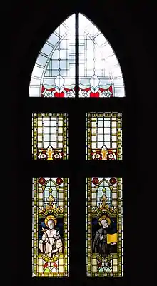The interior of the church has nineteen stained glass windows, three behind the altar and eight along each side of the church building. The windows behind the altar focus on St. Joseph and depict, from right to left, the sojourn of the Holy Family in Egypt; the daily lives of the Holy Family; and the death of Joseph. Four of the sixteen windows on the sides of the church (those closest to the altar and those closest to the doors) depict lilies. The remaining twelve windows each depict a single saint, including Ignatius of Loyola, Stanislaus Kostka, and Saint Cecilia.[28] Further ornamentation of the walls includes carvings depicting the fourteen Stations of the Cross as well as twelve triforiums holding paintings illustrating the Lord's Prayer, the Bread of Life Discourse, and praise to Christ and Mary.[29] On top of the altar, at the eastern end of the church, is a tabernacle. The altar, imported from Germany in 1880, is decorated with statues of Abraham, Peter, Paul, and Melchizedek.[1]