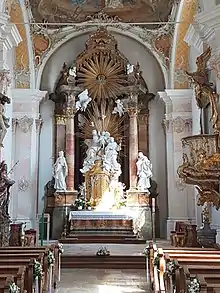 Created by Ignaz Günther, the group of the Holy Family, Mary holding the baby Jesus, Joseph on the right side around a globe, is carved from linden wood. The people next to the putti are painted white for emphasis. Except for the figures, the altar is gilded. It forms an imaginary triangle from the middle putto floating in a halo to the clouds on the left and the lying putto on the right. The lack of an altar painting is unusual, but due to the structure of this construction it was no longer necessary. The altar is accompanied by two figures also framed in white, on the left Saint John of Nepomuk and on the right Saint Francis Xavier.[5]