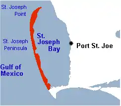 The St. Joseph Peninsula is located in Gulf County, Florida, in the Florida Panhandle, at coordinates 29°42′55″N 85°23′05″W / 29.71528°N 85.38472°W. It is a 15-mile long spit, extending northward from Cape San Blas between the Gulf of Mexico to the west and St. Joseph Bay to the east. It is 6 miles west of Port St. Joe at its closest point. The peninsula is also known as St. Joseph Spit. The northern two-thirds of the peninsula is known as St. Joseph Point.[1]