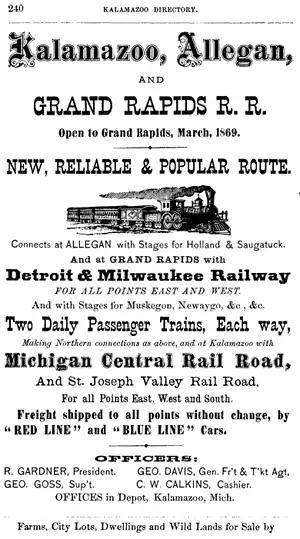 The company was chartered on April 3, 1848, following authorization by an act of the Michigan State Legislature; the bill called for a line from St. Joseph, on the coast of Lake Michigan in Berrien County east through Cassopolis (Cass County) into St. Joseph County. The act stipulated that the company had ten years from the passage of the act to complete its line, a distance of about 50 miles (80 km), or its "rights, privileges and powers [as a corporation] shall be null and void, so far as it regards such part of said rail road as shall not be finished within the periods limited by this act."[1]