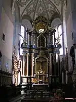 The Collegiate Church of St. Lawrence (Ukrainian: Костел святого Лаврентія у Жовкві; Polish: kolegiata św. Wawrzyńca w Żółkwi) is the main Roman Catholic church of Zhovkva, Ukraine. It was built between 1606 and 1618 as the pantheon of the Polish commander Stanisław Żółkiewski and his family.