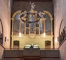 An organ is documented in 1294. The present organ was built in 1712 by Johann Jakob Dahm, who created an instrument with 13 stops on one manual. It was expanded in 1893 by Michael Keller from Limburg, and again in 1959 by Eduard Wagenbach. The original case was retained. The organ now has 29 stops on two manuals.[4] In 2002, the organ was restored by the Marburg firm Gerald Woehl.