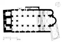 The nave of the present church was built as a Romanesque basilica in the second half of the 11th century. The northern apse dates from around 1100. The two western steeples were later added. The church was changed to a basilica with balconies during the second half of the 12th century.[3] It was completed between 1225 and 1250, and is the mother church (Mutterkirche) of all churches in the middle of the Lahn valley.[2] The church is approximately 39 metres (128 ft) long and 16.5 metres (54 ft) wide.