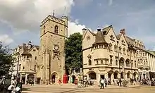St Martin's tower (centre left) and the HSBC building (right), seen from the corner of High Street and St Aldate's