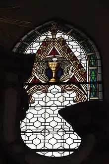 Its ground plan geometry consists of a trapezoid because of streets' restrictions. The width of the presbytery almost does not differ from the width of the main nave. The inner space creates interesting jump straddle vault with pear-shaped profile ribs. The entire space of the presbytery is vaulted by jumping vault. Because of this vault construction the church is considered as a unique Gothic architecture in Prague. Also other similar examples of this type of vault across Europe are younger. Vaults carry stone ribs with a pear profile. Ribs continue directly into the perimeter walls without any connection to the bracket. Interior space on the east side is also shaped by two high Gothic windows with partial stone mangered lining, which was supplemented with newly Gothic reconstruction. On the south side of the presbytery light flows through the third window similar to the eastern side. The windows are filled with colorful inside geometric stained glass. The same applies to the north nave. The great arcade on the west side opens the door to the adjoining southern chapel. On the opposite wall segmently ended, secondarily pulled down arcade meets Baroque chapel of St. Savior.