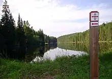 Today St. Olavsleden stretches 564 km from the Bothnian sea in the east to the Atlantic Ocean in the west through two countries and eleven municipalities.[2] The trail is marked with the St. Olav symbol, which marks all the so-called St. Olav roads (Sw.: S:t Olavsvägar), leading towards Nidaros Cathedral. St. Olavsleden passes through the ancient cultural landscape, following as closely as possible the roads and paths that pilgrims of that time and other travelers wandered and rode. The first hundred kilometers the trail mostly follows Ljungan river, and in Jämtland the trail goes along the lakes Revsundssjön and Storsjön, and eventually Indalsälven river. St. Olavsleden crosses the Scandinavian mountains on the border between Sweden and Norway along Swedish county road 322 (Skalstuguvägen) and in Norway goes through the agricultural landscape near the Trondheim fjord. St. Olavsleden is moderately hilly which makes it suitable for cycling.[3]