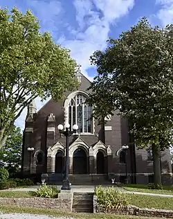 St. Patrick's Church measures 130 by 65 feet (40 by 20 m) and its exterior is composed of Black Hylex St. Louis pressed brick.[4] The exterior has features from both the Gothic Revival and the Romanesque Revival styles. The Gothic features are found in the pointed arched windows and door frames, the quoined stone surround of the large front window, the wall buttresses that flank the main entrance, and the stone trim on the gable. The hinges on the front doors are also executed in the Gothic style. The Romanesque features include the stone trim combined with its brick finish, the stone bands that form the water table, the wall buttresses with their decorative stone caps, the domed corner buttress, the corner tower capped with a battlement, and the projecting front pavilion with its multiple gables. There are similar bands from the water table at the cornice line that surrounds the tower. Other features of the exterior include a raised foundation, corbelling under the eaves, a rounded apse on the rear of the church and confessionals that project from the side elevations.
