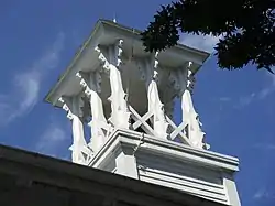 The parish hall features a forty-five degree turned corner tower and entryway. At one time it was capped with a spire.[3] Elaborate shingling is found in the gable end, below the lancet windows on the main facade, and on the tower. A row of Maltese crosses are located at the cornice level of the tower. Three lancet windows line the side walls.