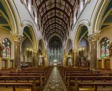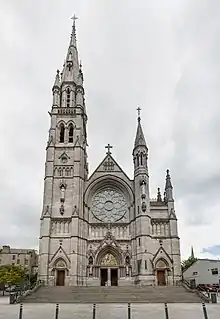 St. Peter's Roman Catholic Church is located on West Street, Drogheda, County Louth, Ireland. Designed by J. O'Neill and W.H. Byrne and built in the French Gothic style of local limestone ashlar in 1884. The church is famous for its tall west gable, rose window and for containing the national shrine of St. Oliver Plunkett.