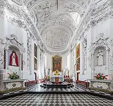 The church has one central nave. Similar to the Church of the Gesù in Rome, the narrow side aisles are turned into interconnecting chapels.[10] There are four chapels: Women's or Queens', Saint Augustine's, Saint Ursula's, and Soldiers' or Knights'. The Queens' chapel was originally dedicated to Saint Petronilla, traditionally identified as daughter of Saint Peter.[29] The chapel has four figures representing women's virtues: piety, generosity, purity, and assiduousness.[29] The figure of generosity presents a stark social contrast between a wealthy lady and a pauper.[28] Some art historians attempted to associate these figures with Queens of Poland.[29] Painting of Saint Monica, mother of Saint Augustine, hangs in the chapel.[30] The ceiling has scenes of executions and torture of early Christian martyrs, including Saint Fausta and Saint Theodora.[26] The Knights' chapel has four figures of soldiers who became early Christian martyrs, including Saint Martinian, who helped Saint Peter to escape prison, and Saint Florian. The chapel also has a scene of Saint Casimir miraculously helping Lithuanians in the Siege of Polotsk[3] and Saint Wenceslaus fighting with his brother Boleslaus the Cruel.[27] This chapel clearly reflects Pac's interests: he dedicated most of his life to military[3] and thought of himself as a knight.[9] The chapel of Saint Ursula has more figures of early martyrs (Saint Apollonia, Saint Barbara, and Saint Catherine of Alexandria) that emphasize purity.[12] The chapel of Saint Augustine emphasizes his teachings on Holy Trinity as undivided unity.[12]