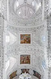 St. Peter and St. Paul's is one of the most studied churches in Lithuania.[20] Its interior has over 2,000 different decor elements that creates a stunning atmosphere.[21] The main author of the decor plan is not known. It could be the founder Pac, monks of the Lateran, or Italian artists. No documents survive to explain the ideas behind the decorations, therefore various art historians attempted to find one central theme: Pac's life and Polish–Lithuanian relations, teachings of Saint Augustine, Baroque theater, etc.[20] Art historian Birutė Rūta Vitkauskienė identified several main themes of the decor: structure of the Church as proclaimed at the Council of Trent with Saint Peter as the founding rock, early Christian martyrs representing Pac's interest in knighthood and ladyship, themes relevant to the Canons Regular of the Lateran, and themes inherited from previous churches (painting of Blessed Virgin Mary of Mercy and altar of Five Wounds of Christ).[22] The decor combines a great variety of symbols, from local (patron of Vilnius Saint Christopher) to Italian saints (Fidelis of Como),[23] from specific saints to allegories of virtues. There are many decorative elements – floral (acanthus, sunflowers, rues, fruits), various objects (military weapons, household tools, liturgical implements, shells, ribbons), figures (puttos, angels, soldiers), fantastical creatures (demons, dragons, centaurs), Pac's coat of arms, masks making various expressions – but they are individualized, rarely repeating.[24] The architects and sculptors borrowed ideas from other churches in Poland (Saints Peter and Paul Church, Kraków, Sigismund's Chapel of Wawel Cathedral) and Italy (St. Peter's Basilica, Church of the Gesù).[23]