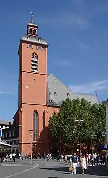 The origins of the parish probably date back to the time of the Merovingian dynasty, as evidenced by the patronage of Saint Quintin, which was later almost forgotten. The second patron saint of the church is Saint Blaise, of whom St. Quintin had a head reliquary. St. Quintin was first mentioned in a document in 774.[1][2] Later, the first inner-city parish cemetery was located near the church (first mention in sources around 1100). It is regarded as certain that St. Quintin already existed in the 8th century; in the 7th and 8th centuries an extensive church building activity had begun in Mainz. Today's construction began around 1288 and was completed around 1330 in Gothic art. As early as 1348, this building suffered severe damage when a fire, set during a plague pogrom, spread from the nearby Jewish quarter to the church, which destroyed the windows of the nave and melted down the city bell in the tower. Starting 1425 the damage could be repaired. The chapel extension south of the choir with the old sacristy (today's storeroom) was built as well. During the Thirty Years' War the church served as a barracks for the Swedish troops. At times evangelical church services were held there. In 1721 the church was completely redesigned baroque and re-equipped. In 1813 the church served again as barracks, this time for the French troops after the Battle of Leipzig. The church underwent a fundamental renovation and repair from 1869 to 1888, after it had been rescued by master builder Eduard Kreyßig from imminent demolition due to dilapidation. The church was furnished in neo-Gothic style. Only the neo-Gothic choir barriers on both sides of the nave have survived from this phase. During the Second World War, the church was severely damaged during the air raids on Mainz in 1942, but the walls were preserved.[3] The valuable arm relic of Saint Quintin was burnt, as were other precious pieces of equipment. The reconstruction and renovation began immediately. A provisional roof was put on during the war and already in 1948 the church could be used again. After the war, it served as a church room for the French garrison. A new relic of Quintin could be worshipped again since 4 November 1950 at the mediation of the bishop of Soisson Pierre Auguste Marie Joseph Douillard. At the end of the 1960s, work was carried out on the exterior and on the bell tower, whereby the church building was given its medieval colouring again in 1970 on the basis of original findings. However, the tower continued to have an provisional roof. It was not until 1995 that the Renaissance tower helmet, reconstructed by hand true to the original, was reattached.