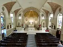 French-speaking Catholics began to settle in southwestern Shelby County and nearby northeastern Darke County in 1823; in their earliest years, these people were served by an itinerant priest, Father Navarron.[2] In 1839, a parish was created for these settlers and dedicated to St. Valbert; its first building was located 3 miles (4.8 km) northeast of Versailles.[3] When the priests and nuns of the Society of the Precious Blood began to settle in western Ohio in the 1840s, St. Valbert's became a mother church for the Society.[4]:6 The parish was split three ways in 1846: the members to the west of St. Valbert's became part of Holy Family parish, while the members to the southeast became part of St. Remy parish; the remaining members of St. Valbert's erected a new building in the village of Versailles in 1864, at which time it was rededicated to St. Denis.[3]