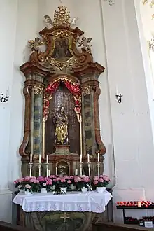 The Lady altar has a valuable carved late Gothic Woman of the Apocalypse from the workshop of the artist Ivo Strigel in the carved bulge decorated with putti heads.[13]