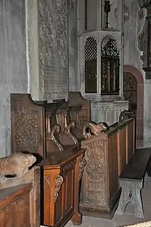 Many people with epilepsy made the pilgrimage to the church. It was therefore furbished with unique carved laity stalls for the congregation; congregants in Gothic times normally attended service standing. The pews are decorated with carvings of ornaments, flowers, vines and inscriptions in Gothic alphabet. One front shows the elaborate "Gerechtigkeitsspirale" (Spiral of justice), an inscription in the form of a spiral.[1][3] The Kiedrich Madonna in the choir is a wooden gilded sculpture dating from 1330. Influenced by French style, it shows a young woman who turns smiling to her child.[4]
