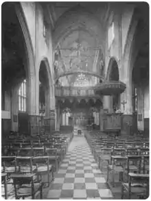 The first church on this site was designed by George Gilbert Scott Jr.[1] and could seat 1,000 people. The church was bombed during World War II and rebuilt by Halliday and Greenwood, to a design by Ralph Covell, in 1956.[2]