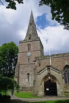 The church is built of Triassic sandstone.[3] The north aisle was added in the 13th century, as was the tower, which now has a broach spire.[4] The 14th century saw the chancel, which is longer and wider than the nave,[5][4] being built and the north aisle enlarged.[2] The south aisle was added the following century and a clerestory was added.[5]