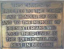 In 1830, a Presbyterian Scots Kirk was founded in Belgium and the Reverend Charles Siveright was the first minister.[1] However, after the Belgian Revolution, there are no further written records of this church.[2] In 1898, The Reverend Francis Gordon was sent to Belgium and conducted Presbyterian church services in various locations in Brussels. This arrangement with services in different places continued for 27 years. The Reverend George R.S. Reid took over from Gordon as minister in 1899 and 150 people attended a Congregational meeting that year. In 1900, the first Elders were ordained. the Kirk Session set up and a special fund was created to raise money for building a church. In 1900 the Brussels congregation was included in the Church of Scotland Presbytery of Edinburgh.[2] As of 2016, it is part of the Church of Scotland's International Presbytery (formerly known as the Presbytery of Europe).
