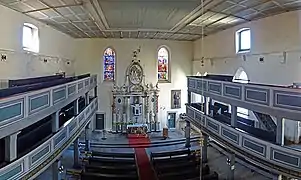 Johann Rudolph Ahle was the cantor at a predecessor instrument in the 17th century, which was built by Johann Georg Kummer from Dachwig. The present organ was built in 1987–1989 by the company Mitteldeutscher Orgelbau A. Voigt from Bad Liebenwerda in the historical organ case from 1787, partly reusing pipe material from the predecessor organ. The instrument has 25 stops on two manuals and pedal. The actions are mechanical.[4]