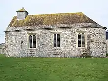 The small flint and stone Norman Anglican Church of St Andrew has an apse at the east end and a barrel vault roof which curves around it.[2] The roof was replaced and windows inserted in the 16th century. The oak door is heavily studded.[1] The interior has limewashed walls, a 15th-century font[1] and flag stone floor, along with early 18th-century oak fittings. The eighteenth century oak pews, the pulpit, screen, communion rails and matching table with barley sugar turned legs, and other woodwork were provided by William Wake, Archbishop of Canterbury, who had been raised in the village of Shapwick and whose family lived locally. The west end has a late medieval gallery with a panelled front which was probably originally a rood screen.[2] The roof is topped by a small weatherboard belfry which resembles a dovecote.[4]