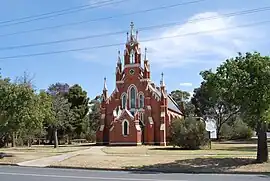 St Andrew's Uniting Church is a finely detailed building constructed of the red brick characteristic of the Deniliquin area. Designed in the Victorian Free Gothic style, the Church is flanked by a series of buttresses and a tower dominates its front elevation. The steep pitch of the slate roof is reflected in the multitude of pinnacles which combine with small flying buttresses and some Romanesque elements to decorate the tower. This theme is repeated in the entrance porch centrally located at the front of the Church.[1]