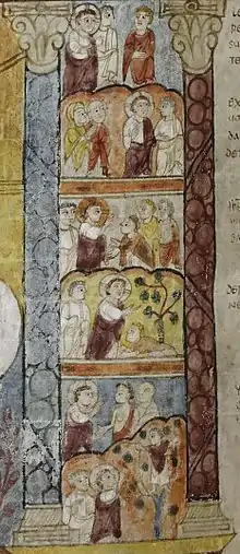 The manuscript once contained evangelist portraits for all four Evangelists, preceding their gospel, a usual feature of illuminated Gospel books, and at least three further pages of narrative scenes, one following each portrait page.[15] Only the two pages preceding Luke have survived. However the surviving total of twenty-four small scenes from the Life of Christ are very rare survivals and of great interest in the history of Christian iconography, especially as they come from the old Western Empire – the only comparable narrative Gospel cycles from manuscripts in the period are Greek, notably the Rossano Gospels,[16] and Sinope Gospels, or the Syriac Rabbula Gospels. The equivalent Old Testament cycles are more varied however, including the Greek Vienna Genesis and Cotton Genesis, the Latin Ashburnham Pentateuch, the Quedlinburg Itala fragment, and some others.
