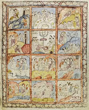 A full-page miniature on folio 125r prior to Luke contains twelve narrative scenes from the Life of Christ, all from the Passion except the Raising of Lazarus. This was included because, following John 11.46 ff. it was considered the immediate cause of the Sanhedrin's decision to move against Christ. As in the few other surviving cycles of the Life from the 6th century, the Crucifixion itself is not shown, the sequence ending with Christ carrying the Cross.[34] However at least two further such pages once existed, at the start of other Gospels.[35] Luke is the third gospel, so a panel preceding the Gospel of John might well have completed the Passion and Resurrection story, and two others covered the earlier life of Christ. The scenes around Luke's portrait notably avoid the major episodes in Christ's life such as his Nativity, Baptism and Temptation, probably reserving these scenes for other grid pages.