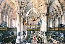 The brick Gothic building was Germany's second Dominican monastery after St Catherine's Monastery in Frankfurt. Its imposing church was consecrated to Saint Catherine in 1285.[1] The monastery was extended in 1400 but was closed in 1528 as a result of the Reformation. The grammar school known as Schola Bremensis or Gymnasium Illustre moved into the premises and, from 1660, was served by the Bibliotheca Bremensis, the extensive library which was established there.[2][3] In the early 19th century, the church was the city's arsenal as can be seen from Jacob Ephraim Polzin's painting.[4] For a short period from 1900 to 1905 it even became home to the city's historical museum with Johann Focke's collection.[1] It was later used by local merchants as a storehouse. After suffering serious damage during the Second World War, the church was demolished in 1960.[4]