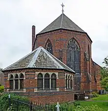 The church is constructed of red brick, with stone dressings and plinth and dark brick bands. It has angled buttresses, and a steep slate roof covering both nave and chancel, topped by a small bellcote. The nave has side aisles, and the east end is in the form of an apse. The windows are lancets, those at the east and west ends having three lights, with two-light windows either side. The stained glass in the east window was designed by Jean-Baptiste Capronnier in 1875. Inside, the arcades are of brick, with stone piers and detailed stone capitals. There is a circular stone font, and an octagonal stone pulpit. The choir stalls and screen are later, and were designed by Robert Thompson.[3]