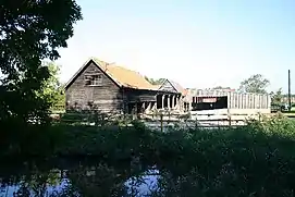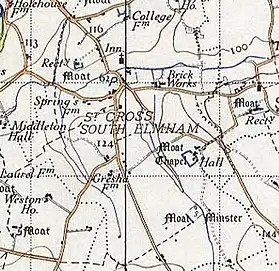 The parish contains South Elmham Hall, surrounded by a four-acre moat and which was formerly the country residence of the Bishop of Norwich.[5] The hall is currently known as Bateman's Barn and offers guided historic tours of the house and its grounds during the summer months.[12] South Elmham Hall has been listed as a grade one building.[13] The building contains primarily 16th century architecture, alongside 15th century arches constructed during the Bishops ownership of South Elmham Hall.[7] The primary attraction of the South Elmham area to the Bishops was the hunting opportunities provided by a deer park established in the local area.[9] This was not without problems with reports of the deer being poached by the residents of St Cross in 1315. The Hall also hosted royal family members on several occasions, most notably in 1326 when Edward II stayed for ten days on his way to Norwich, carrying out government business during his stay there.[9] The remains of previous buildings and settlements nearby to the hall have long since decayed, although around 45 detailed surviving records in the Suffolk Record Office indicate the area used to contain stables, mews and gatehouses.[9] The ruins of one of the gatehouses survives and can be still be seen today. South Elmham Hall also has the earliest domestic wall paintings in Suffolk, dating from 1270.[9]